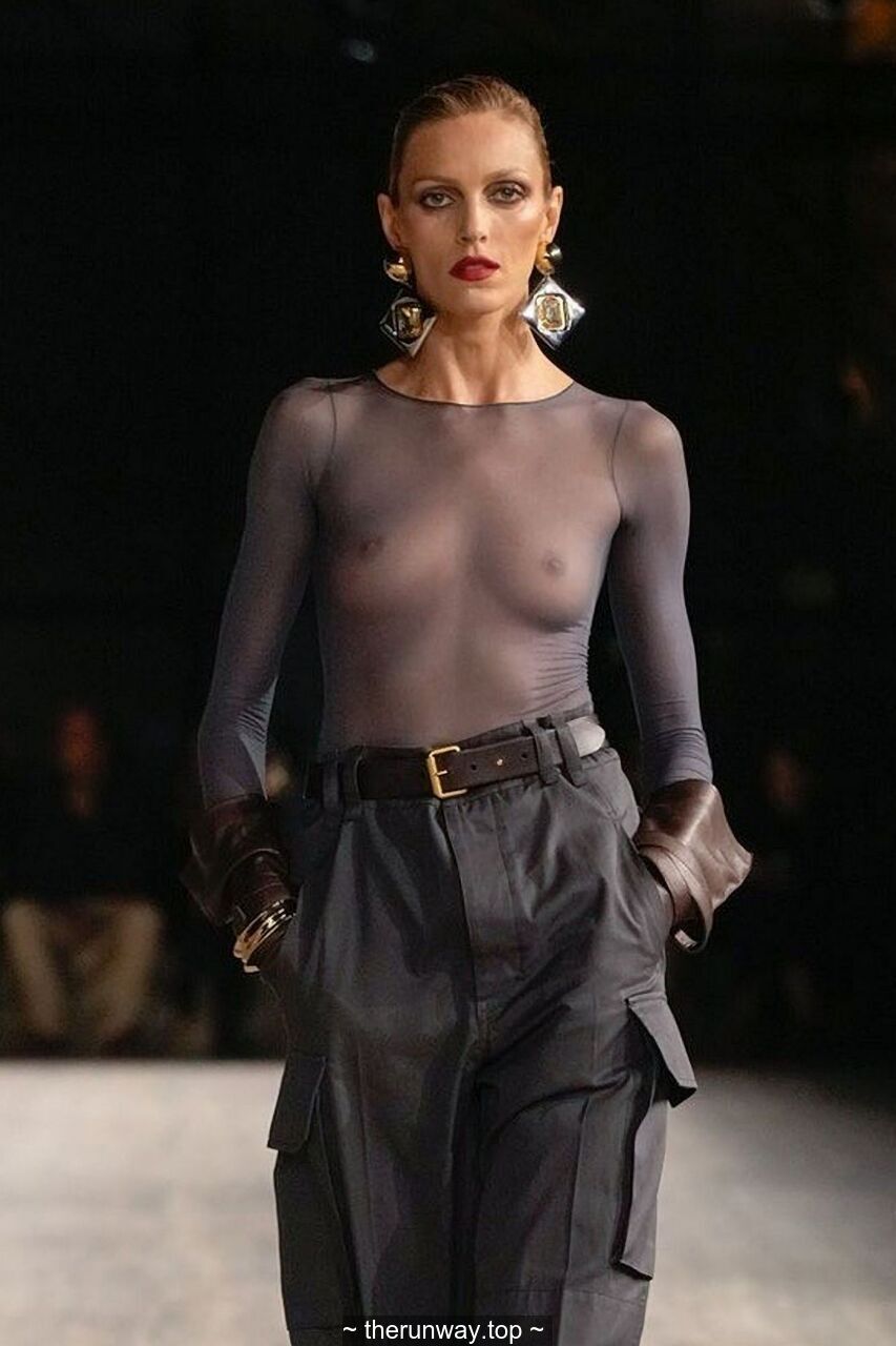 2025-Oct-27 Anja Rubik braless in see through top at the Saint Laurent Fashion Show in Paris Continue reading